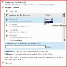 To give specific other users access to files: Click “Folder options”, and then click “Change permissions”. ”Click People I choose”, check box for each of your contacts that you want to add. Or add people who aren’t in your contact list, using their E-mail address (they will be invited and will have to sign up – send them a heads up to check their junk mail folder):