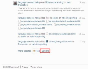 A powerful feature of Windows Live is the What’s new RSS feed which can save you a lot of time by aggregating important news from your professional (e.g. http://hale-interpreting.groups.live.com or http://hale-translation.groups.live.com) and personal (remember, it is only aggregated for you and your login) live. And you can customized what you want to see there, if you at the end of your “What’s new”section on http://home.live.com click on options, like here: