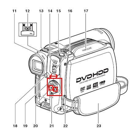 - On the camera, turn the wheel, using the grey knob (22), to “HDD”, and press the red button (20)