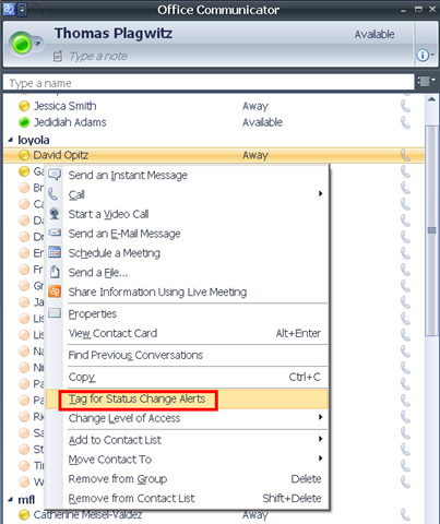 From MS-Help: Tag a contact so you are notified when they are available: “Communicator can notify you of changes in a contact’s availability by displaying an alert whenever their presence status changes to Available or Offline. The alert shows the contact’s name, title, instant messaging address, and new presence status. You can click the alert to start an instant messaging session with the contact. Configuring Communicator to display this alert for a given contact is called tagging.”