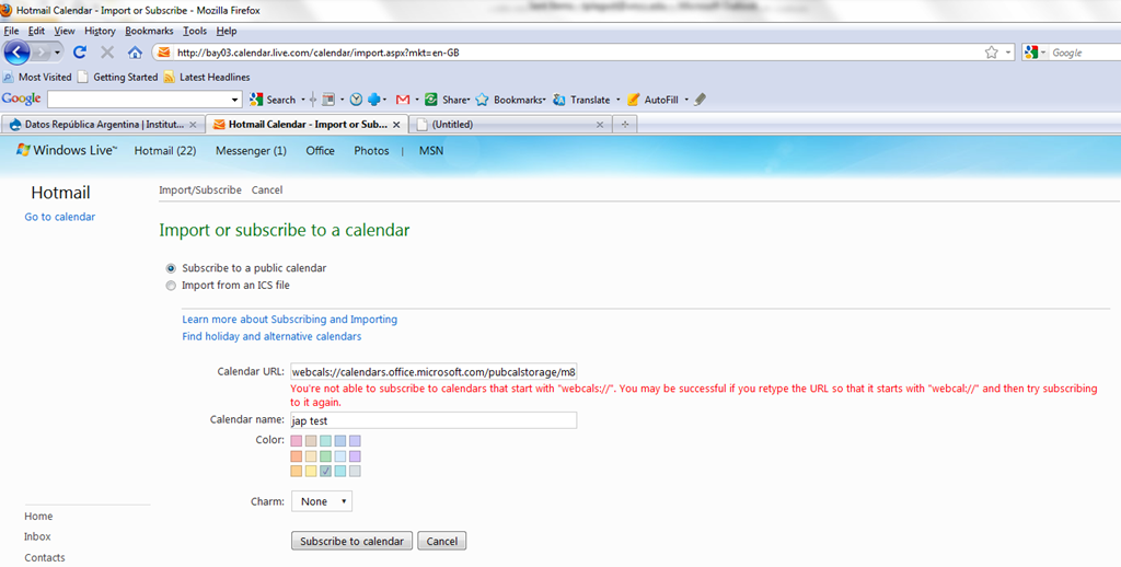 Select Subscribe to a public calendar, and then, in the Calendar URL box, paste the “webcal://” link from the LRC website for the tutoring hours or other LRC schedule that you want to keep an eye on. You begin the link either with “webcal:” or “http:”. Note, however, that trying to subscribe to “webcalS” will result in this error: