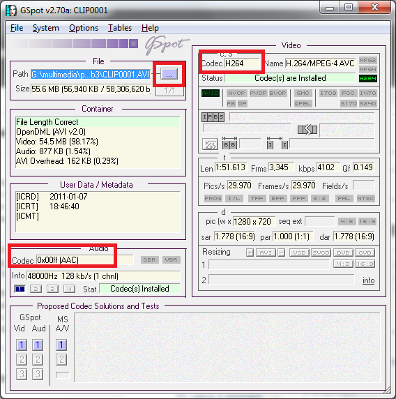 If VideoLan cannot display your video either, download, extract, start and open the video with this utility from here , to diagnose which codecs your video files uses, like so: