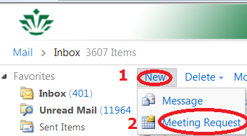 – an email with calendar information. - In OWA, start writing a (2) meeting request, like an email, from the (1) menu: ”new” (click not on “new” directly, but on the arrow next to “new” to unfold the menu: