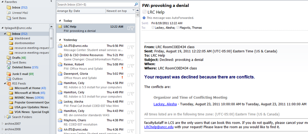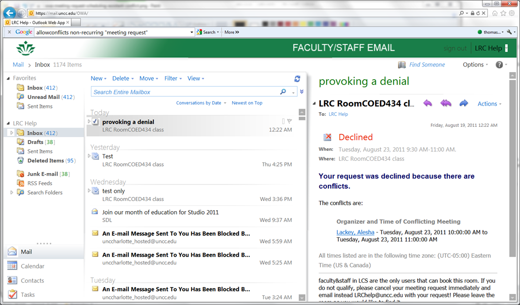 - if you requested a recurring/repeating meeting, like for a weekly class meeting in the LRC, there may be individual conflicts. Note that we have set the resource scheduling options for the non-conflicting instances of your request to be accepted (in most cases). For how to deal with the conflicting instances, study the conflict information in the denial response.