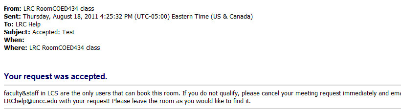 - Note that the LRC calendars are set up so that the LRC staff is copied (as delegates) on LRC resource requests (as a backup for issues and paper trail for reporting):