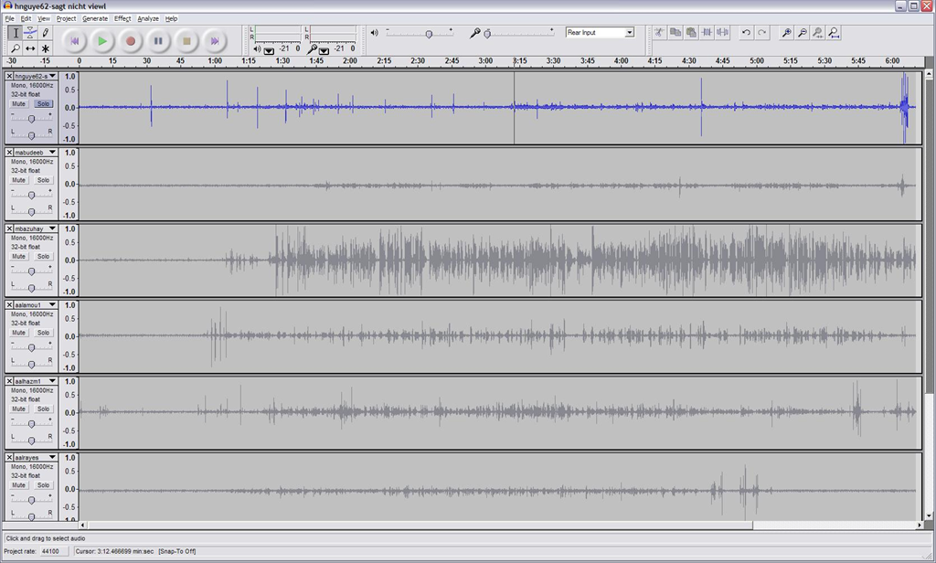 - You can load this recordings in Audacity to grade them, including skipping past the questions and increasing the play speed, but not the pitch, and easy comparison of students like in the picture below: