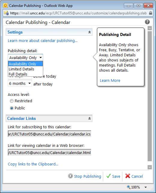 - It is advisable to publish the calendar not with “Availability” only, but with “Limited Detail”, so that additional information (office hours dedicated to specific support topics/clinics, specific requests by clients) can be passed back and forth between support personnel and clients (and anything is better than “Free/Busy” which is especially misleading for such office calendars). Note that even if OrganizerInfo is included on-premise, it seems not included on calendars published to the internet (option “public”; “restricted” has not been tested), which makes Limited Detail possible in our environment.