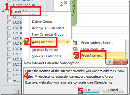 and choose “Copy link” from the context menu. - I have not found a way to feed the Moodle iCal link manually into MS-Outlook 2010 (Shared Calendars / Add Calendar / From Internet) or OWA (different problem comes and goes. Just subscribe while problem is gone