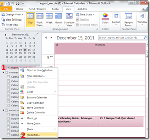 - Don’t forget to rename your calendar to something more useful than the default, like “My classes”, by right-clicking and choosing “Rename”in OWA or “Properties” in Outlook2010.