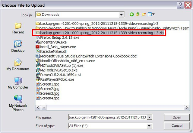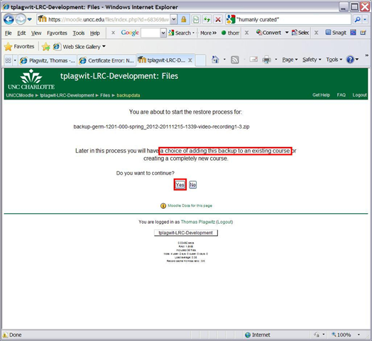 Here I am restoring the backup I made from a different user’s Moodle course in part 1:backup, to add the learning content to my own target course: