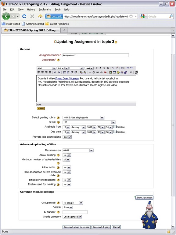 - Instruct your students how to take the MS-Word upload assignment, and when (if you leave the default availability/due date on, the assignment will automatically appear in their Moodle Calendar, and can appear in their Ninermail calendar).