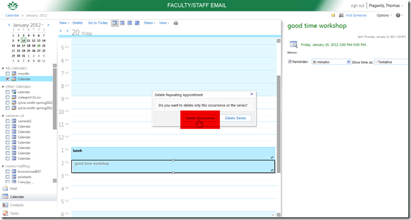 1. right-click on and choose delete the appointment (if necessary, the system is smart enough to ask you whether you want to delete an entire series of appointments or only this occurrence; on cancelling, see also here). owa-update-recurring2_thumb[1]