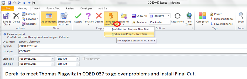 LRC Outlook/Exchange 2010 Resource Calendaring: How to alter meeting times in OWA