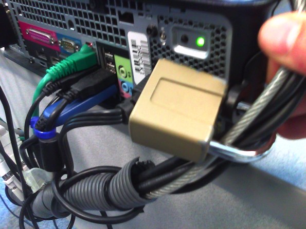 Cables tied to one another seems to be not stable neough. Maybe try, on top of the old (loop-headphone-cable-through-)washer-trick, a cable-tie looped through the rear grate openings which are closer and more accessible than the already installed lock?