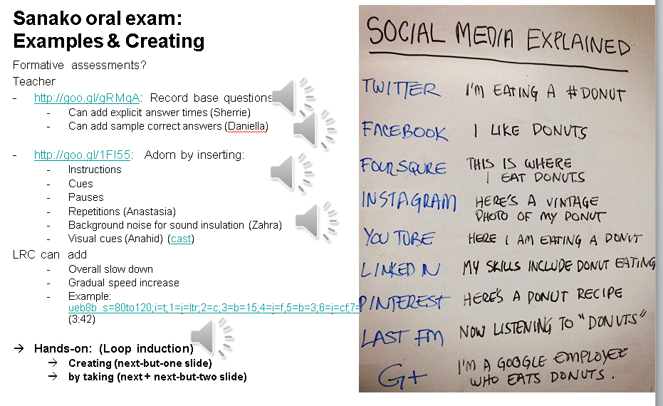 Think converting your textbook-based “drills” into Sanako, like repetitively recapitulating the newly acquired vocabulary item “donut” with different cues: