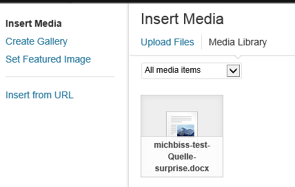 How do you link files from an article? Click on button: “Add media”, and drag&drop files. How about previously uploaded files? Click on button: “Add media”, tab:”media library” (instead of the default tab:”upload files”) , ad find your previously uploaded file in the list.