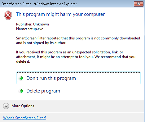 - On IE9 and up (on Windows 7 and reportedly even more so on Windows 8), you may have to bypass Smartscreenfilter warnings like so: