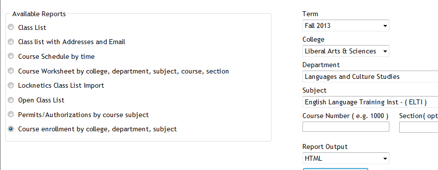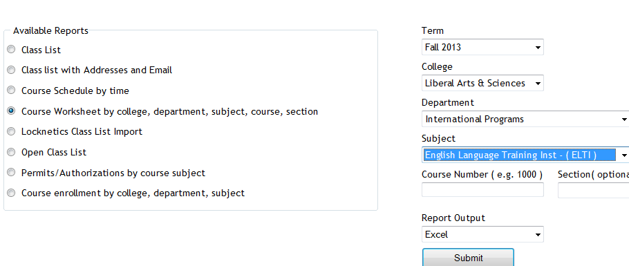 Problem: I used to, but cannot anymore get the course worksheet for ELTI out of Report Express. My choices: