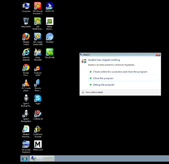 - Workaround: “close the program” – helper.exe seems to autorestart the student.exe.
