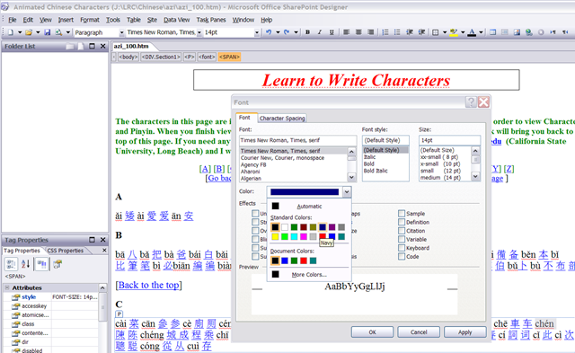 . - Note 2: The CSS style markup that SharePointDesigner puts in smartly for the font color change is ignored by Internet Explorer 8 (Huh?!), so we will have to TBA:ask students to use Firefox instead.