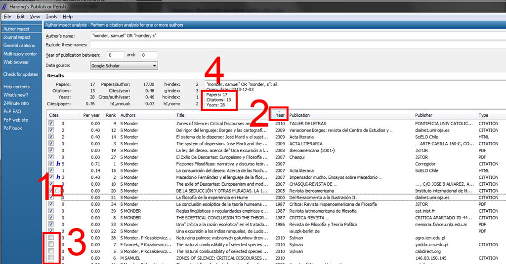 - Here is the result for a somewhat less basic query. You can (1) merge identical results by drag and drop, (2) sort by clicking the column header – for finding more duplicates and other examinations of the result set –, with the 1st sort level being the (3) checked/unchecked status. Note that the s”results”summary conveniently aggregates only the items from the query result set that you have not unchecked: