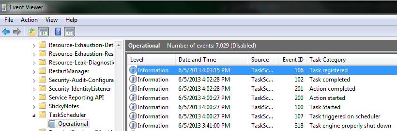 + R, type “eventvwr.msc”, press “OK: Application and Services Logs /Microsoft /Windows /Task Scheduler /Operational: -