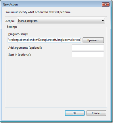 Tab: Actions, button:new / window:new action, button:browse, desktop/LangLabEmailer , button:open