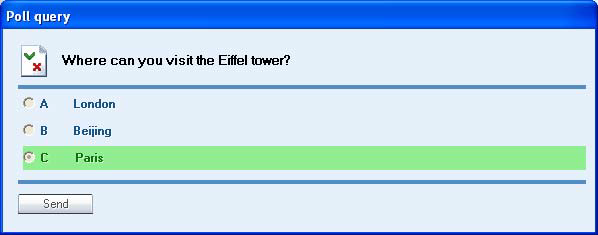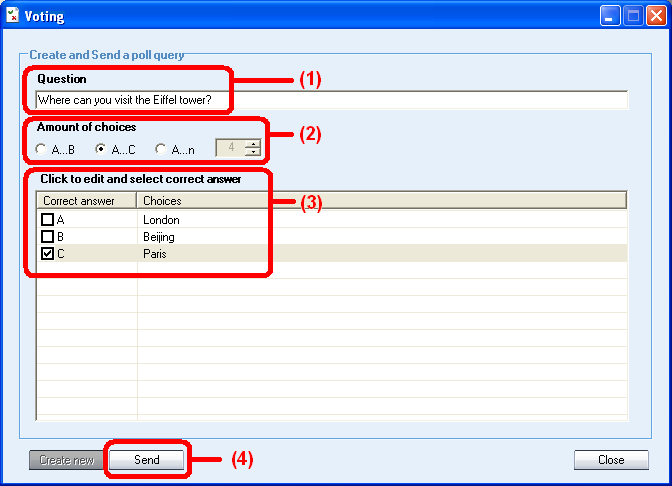 - The teacher enables students to give Voting from their student player interface by pressing the Voting button, entering questions, answer options, optionally marking one (and only one) answer as the right answer and clicking “send’ to the students,