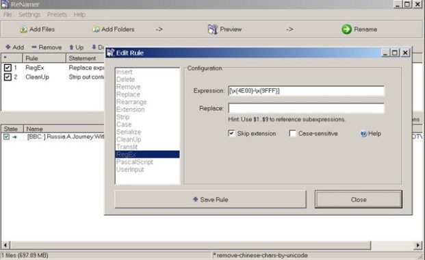 Renamer also has in-built support for common tasks like cleaning up filenames by stripping common tags, transliterating foreign alphabets or adding file numbering (serializing).