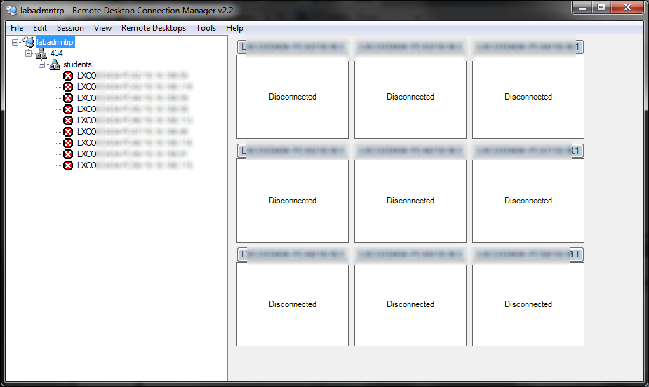 - We provide access to a subset (which is easily set and edited in the RDG file loaded into Remote Desktop Connection Manager, which is stored on a shared network drive so that we can update the connection files without disruption of faculty access should there be network changes) since we teach faculty not to log out currently logged in users when they try to connect, but rather choose another computer from the subset that is free to not. We exclude computers used in classes where we frequently have high-stakes exams. We also have high-stakes assignments (using Respondus Lockdown browser)
