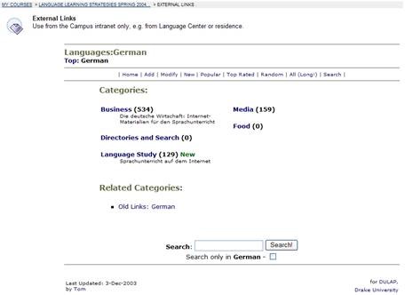- the other content branch consisted of not teaching-related “”authentic materials””: the early day web applications, sometimes multimedia (maps, audio and video collections, news), often times also self-service database interfaces (online shopping and public services) whose language-wise rather restricted interface and topical focus (think Wirtschaftsdeutsch) lent themselves to capstone exercises at the end of textbook chapters (our “Friday in the lab””, not even a language lab then. Geek bonus points: one of these Fridays, a future queens university educated engineer asking me whether i had written all these pages they browsed through in the searchable catalogue of eventually 1500 links. Well, dynamic web pages were not common at all in education in those days, and the credit goes to Gossamer Threads.).