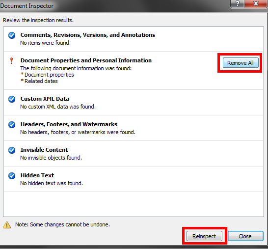 - to remove all privacy relevant information, like so: (5) unfold “check for issues”, (6) “inspect document””,