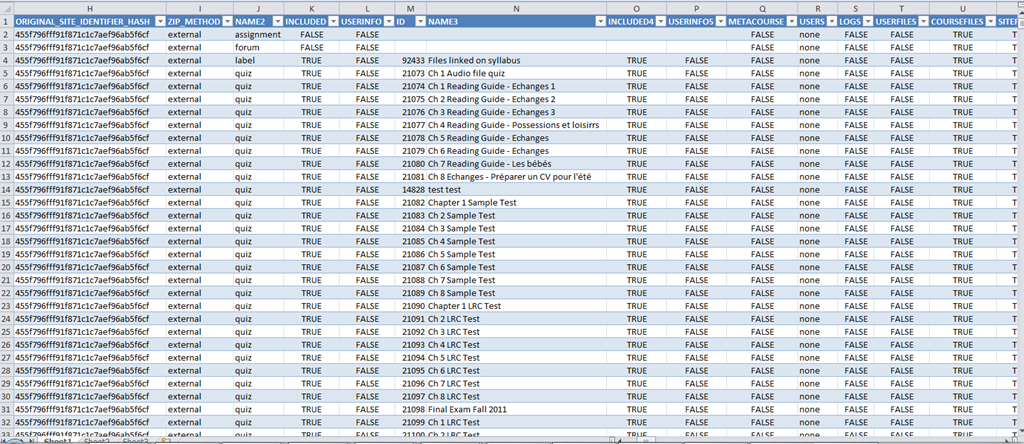 - A little more instructive are the Moodle course export file columns in a handy list, with sample content (where available in our case – sample content does not represent an actual “row”, but merges multiple “rows”, using Excel’s “Paste Special’/ “Skip blanks”):