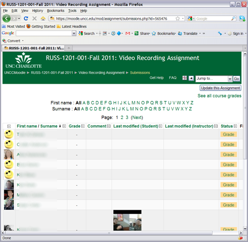 play the video, add helpful comments, if any, add final Grade and click “save and next” (but click “next” if no video submitted yet and you grade before the submission deadline. Better: do not grade before the submission deadline). - If video seems unwilling to play (frozen frame), drag the play cursor forward on the timeline underneath the video.