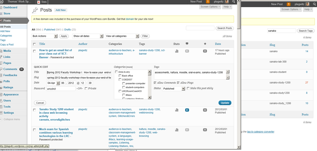 I am talking about merging spurious variant tags into one canonical form. This is a workaround for the fact that you cannot just update when the update could require wordpress.com to merge the article set form the old tag into an existing article set under the new tag. The work around involves accessing the spurious tags from the admin / tags interface (window on the right); then opening the "posts" for each spurious tag in a new window. In the posts window to the left, do the "quick edit". I tried saving myself some deleting in the left window by, after opening the left window, deleting the tag in the right window; but the old tag has already been preloaded for the Quick edit into the left window . Well, Quick edit makes it pretty painless. Is a global search/replace for wordpress.com conceivable? Warning: Don’t hit "Edit" after deleting the tag and try to go back – you will have to hunt for your posts manually.