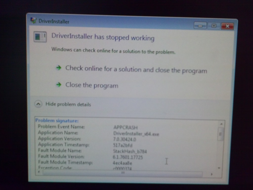 Update: I think this could be a Sanako issue. The release notes for Sanako Study 1200 ver 7.1 mention: “Fixed issue where a "DriverInstaller has stopped working" notification was shown in Windows 7 64bit environments when Student application was started up after crashing ”. This indeed looks like the context I have been seeing this in regularly: ![]()