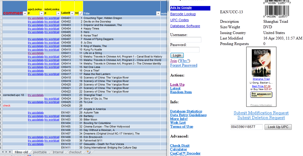 To access more in-depth (and accurate, especially foreign language-wise) information about the films in our media collection that we can possibly maintain ourselves, we added the ISBN and UPC/EAN identifiers from the collection items to our new online film-collection list. This allows us to link collection items to- worldcat.org,