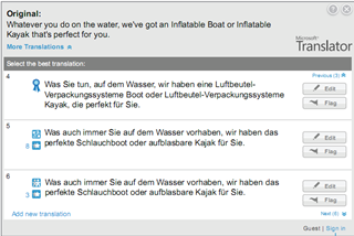 Microsoft Translator updated their Collaborative Translations Framework yesterday, which blends machine translation – their Bing Translator translation service where Google’s quality of translation seems to be noticeably ahead of them – and crowdsourcing – maybe this can give their QoS “a leg up” (“= auf die Sprünge helfen”) – with an attractive interface that lets you manage dedicated and drive-by translators of your website and: It’s free (meaning of course: the business model is “you”. They’ll harvest your input to improve their product, like all web services these days).