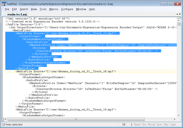 Expression Encoder 3 crashed a few times during encoding this queue of 3.500 audio files. In addition, it took a long time to reload the .XEJ project files of such a size. It is, however, easy enough to inspect the XEJ in an XML editor: