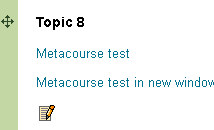 How is included in these helpful hints from a metacourses user: “The only minor problem is that the student navigation might leave them in the metacourse instead of the normal section course. To lessen this effect, I always launch links to the metacourse in a new window. Normally students understand that they need to close the popup window when they are finished with it. There are several advantages to using metacourses in this way. First, it saves having to upload the same materials more than once. I can change a file in the metacourse and know that it is changed in all section courses. Second, it saves storage space. Third, it provides the possibility of developing learning objects or mini courses that can be quickly linked to create a new course. Finally, it would allows several teachers to pick and choose what materials to include in their section courses. One hint, I put all activities (assignments, forums, journals, etc.) in the child course, not in the metacourse. This keeps grading segregated” .