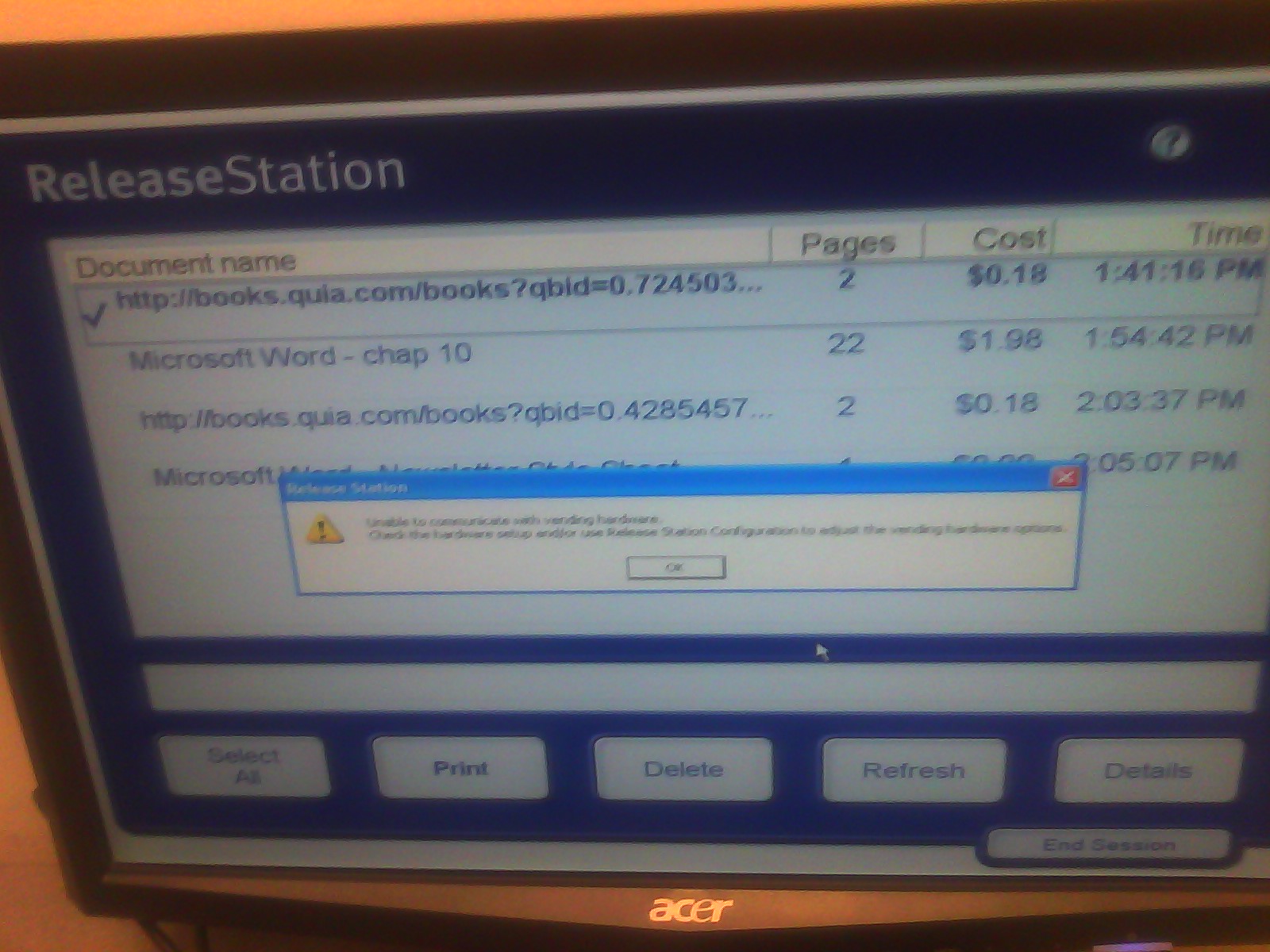 - Problem: You get this error message "Unable to communicate with vending hardware" (when student swipes the student id card):