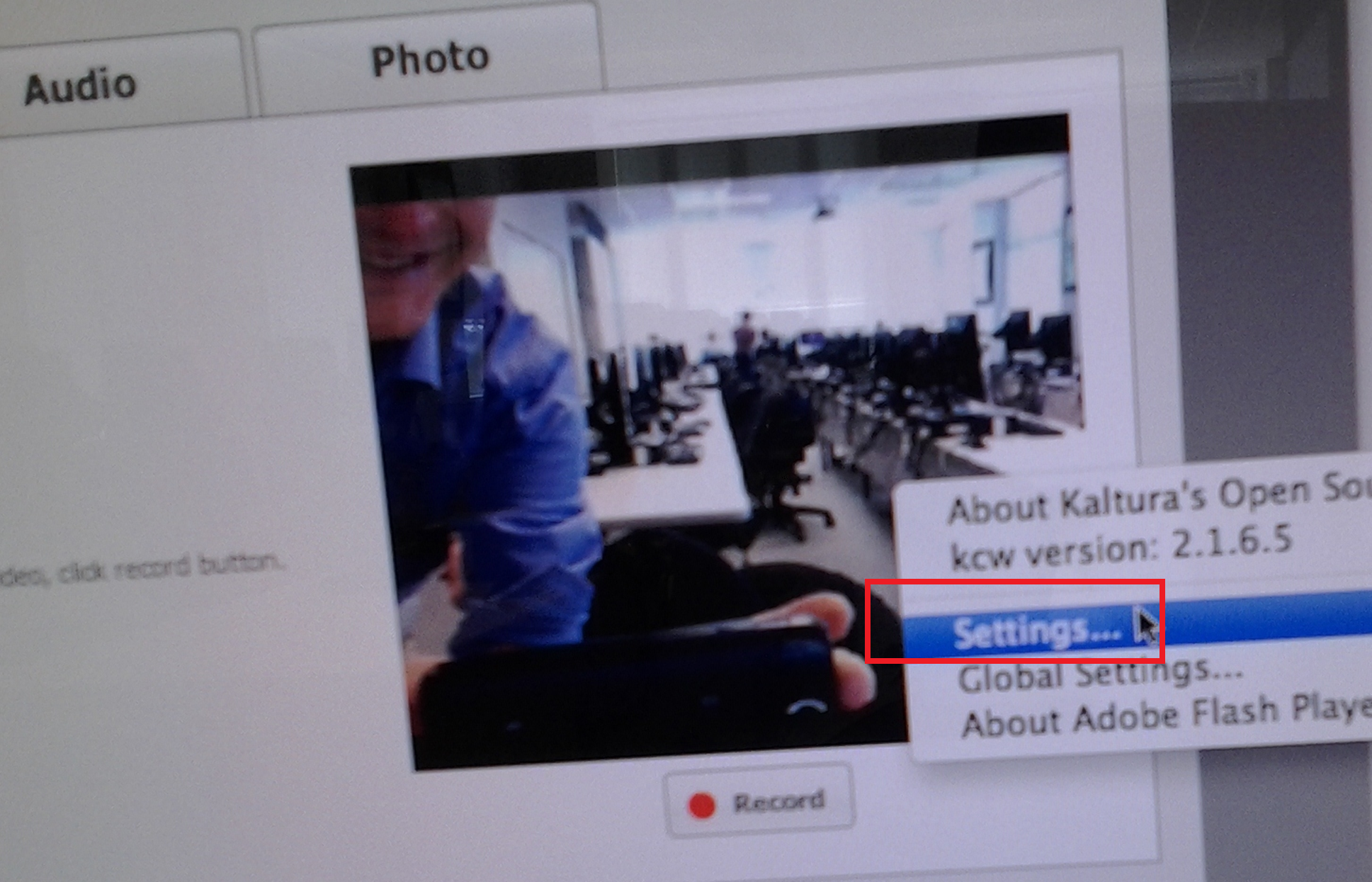 - Check the headset microphone audio: The external headset microphone on the iMacs did not work., but now it does, provided you do this: control-click on Flash’s a video preview window (= the window where you see yourself like in a mirror) for the web camera, and click on “settings”.