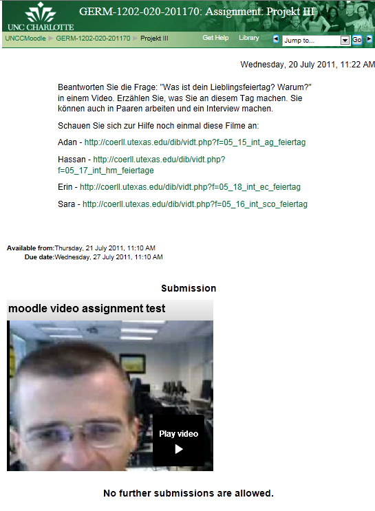 - Video recordings allow for a more authentic assessment of spoken language proficiency. Today, we could test a new Moodle video assignment type for Almut’s Summer II Elementary German II class: Preparing a natural sounding statement on one’s favorite holiday. This Moodle assignment type is an extension to students of the teacher video upload tool using a service Kaltura – we hinted at that earlier.