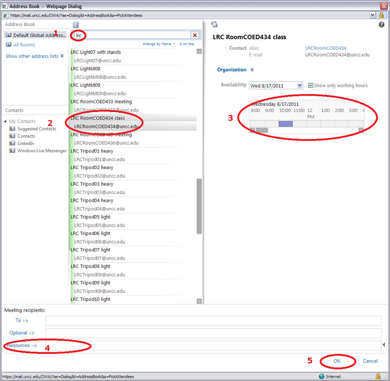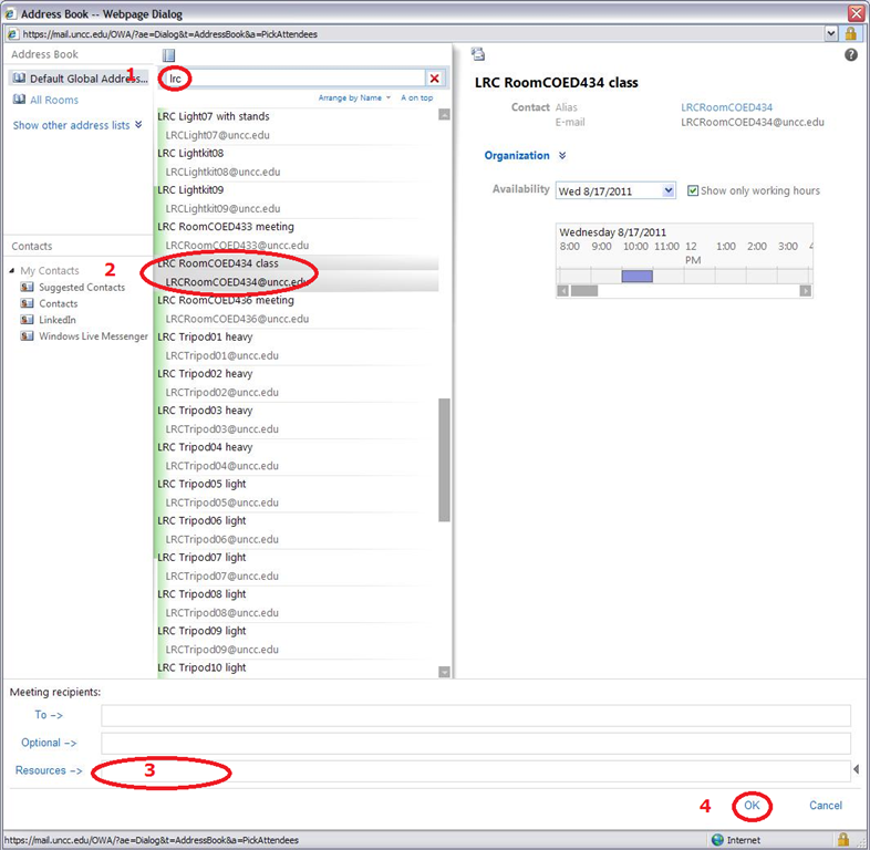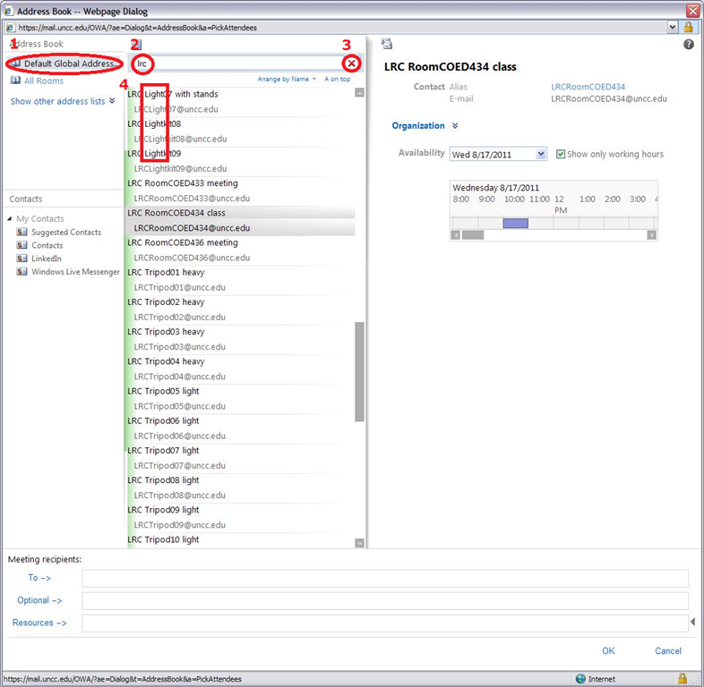 LRC Outlook/Exchange 2010 Calendaring: How to use the Global Address list/Address Book for LRC Resources in OWA