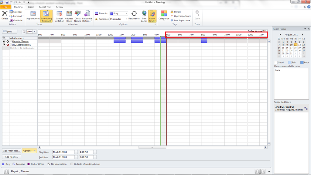 - The scheduling assistant lets you find a common free time for all the (resource and human) participants of your meeting request.