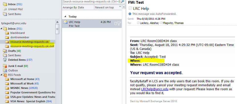 Room and Equipment handling using MS-Exchange Resource Mailboxes with Autoprocessing: AutoAccept and ForwardtoDelegates