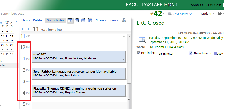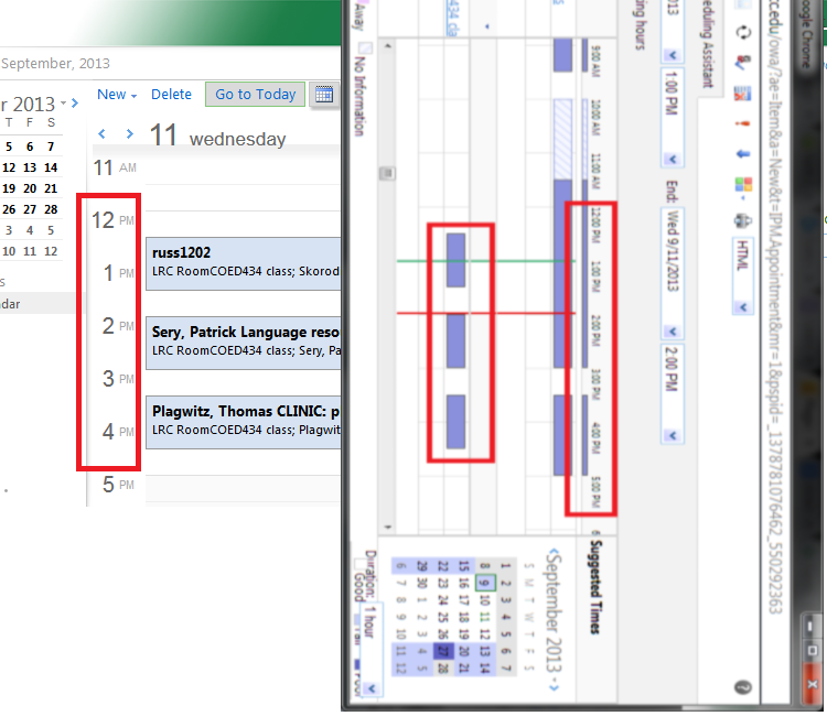 - A traditional issue around the LRC is getting busy teachers to agree on a common workshop time. Ideally, the scheduling assistant would automate this by allowing you to see the common free time slot in their busy timelines. However, this requires that the university calendaring system has already been widely adopted. In the meantime, meeting requests can still greatly facilitate finding this most common free time, by serving as a poll.