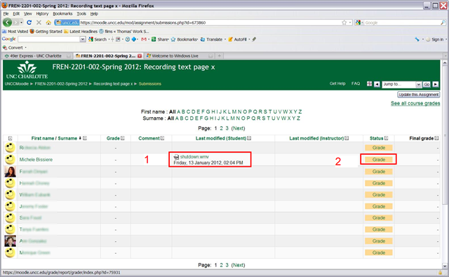 - Here you have an (1) overview who has submitted, and can click (2) to grade;