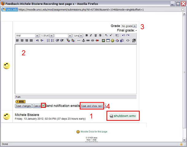 - In the grading dialogue, you can (1) download and open the file submission (see techniques of grading student audio submissions with Audacity), (2) write comments as you assess the file, (3) assign a final grade and (4) save and move on to the next submission (fastest, when you do batch grading, the notify student of your grading feedback is still useful under these circumstances, but even more so when you your self asked to be notified by email of student submissions as they come in: faster feedback)