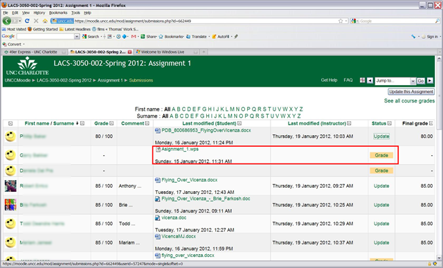 - Where students have submitted MS-Word files in the Gradebook, click (1) button “Grade”: